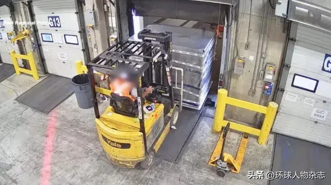案发当天下午 6 时 32 分,距离这批货物被转运至仓库刚过去 42 分钟,一个穿着深色衣服和反光背心、戴着口罩的男人,便驾驶一辆白色卡车来到仓库。