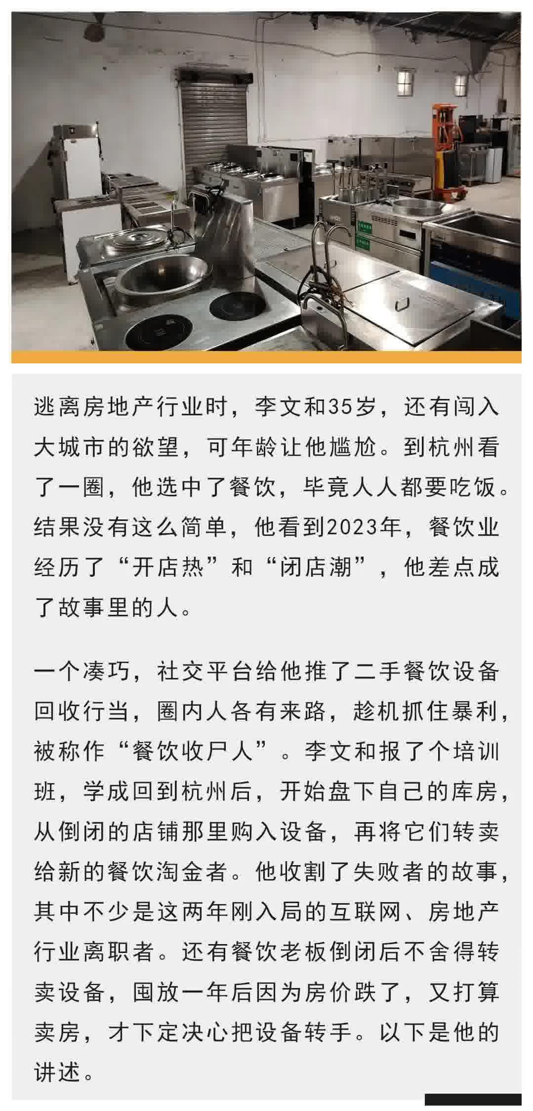 今年回收的时候,我遇到过一位女老板,她在餐饮店倒闭后,把设备都囤在自己买的房子里,不舍得转卖。她的房子在临安,离市区很远,同行没人想跑过去收,我刚开仓,才愿意花时间和精力找她。去了才知道,她是为了卖掉囤放设备的这套房子,才下定决心把设备卖了的 —— 她受到了楼市和餐饮的双重打击。