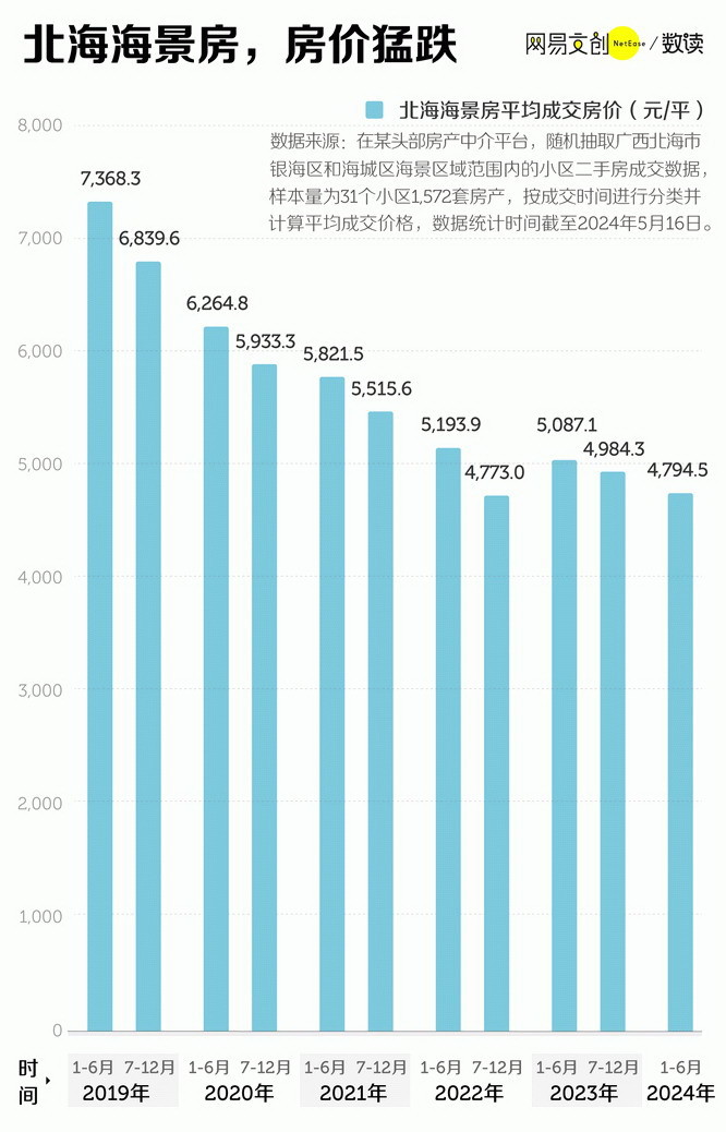 结果发现 2019 年上半年,北海海景房的成交平均价还在每平米 7368.3 元。但在此之后,房价仿佛坐上了急剧下滑的过山车,到 2024 年 5 月,已经降到了每平米 4794.5 元,跌了近三成,让期盼着房价猛涨的业主们始料未及。