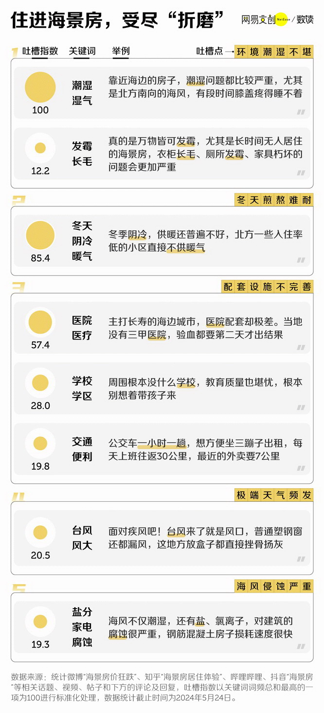 在社交媒体的讨论中,海景房最为人诟病的是潮湿,斑驳的墙面、生锈的家具、短路的家电都是面朝大海的代价。