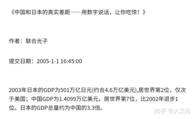2005年,有一个网名叫“雪亮军刀”的网友,在天涯发帖,说根据自己对日本和中国经济的观察,预言中国的GDP将在2030年左右超越日本。