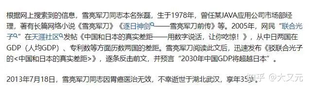 雪亮军刀的预测并不是闲来无事的突发奇想,而是为了驳斥一篇天涯媚日神贴,著名楼主“联合光子”撰《中国和日本的真实差距》。