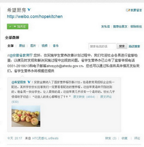 人民网安徽5月27日电(记者何聪) 5月26日下午,“希望厨房”发布微博:安徽金寨纳入了国家营养改善计划,但是教育局招标企业统一配送。某所学校校长拉着我们一定要看看配送的营养餐,这些苹果是昨天刚送到的,准备周一发给学生。让人震惊的是,这些苹果几乎没有一个是好的。校长几乎恨得咬牙切齿:“这些人的良心都哪去了?!”微博迅速被转载。