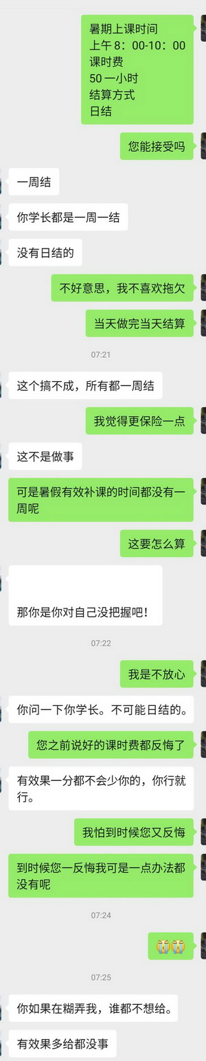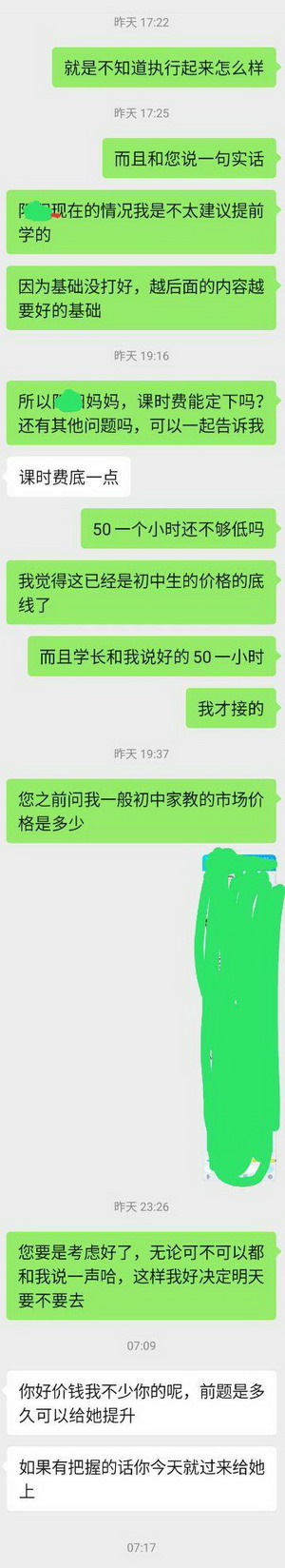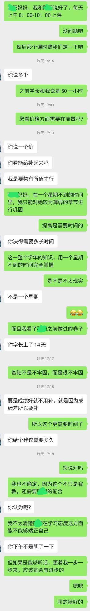 很多评论还在纠结价格和结算的问题。排除掉大学生和家教的干扰项再看看题主和家长的对话吧。