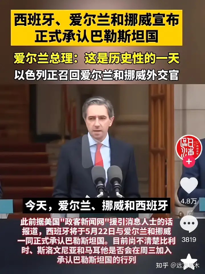 5月22日,挪威、西班牙、爱尔兰同时宣布承认巴勒斯坦国,这三个国家都是欧洲国家,而且是相当发达,在中国知名度很高的欧洲国家。