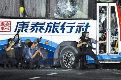 2010 年 8 月 23 日,一个被开除的菲律宾前警察,在菲律宾市中心马尼拉,持枪劫持了一辆香港旅游大巴,车上有包括游客、导游、领队在内的 25 名人质,绝大部分都是香港人。劫匪的诉求是恢复职务和待遇。