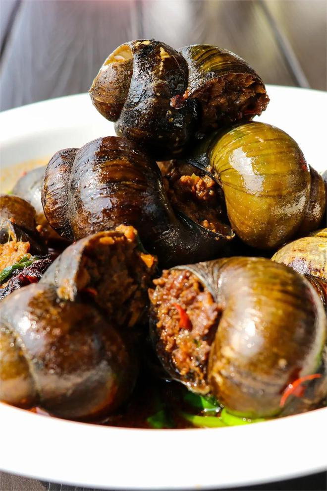 除此之外,在两广一些深受客家文化影响的城市,还能吃到田螺酿,这是客家人们不可缺的时令酿菜,硕大的螺壳里撑满丰富的馅料,吃完肉馅之后,螺壳深处嫩白的螺肉更是点睛之笔。