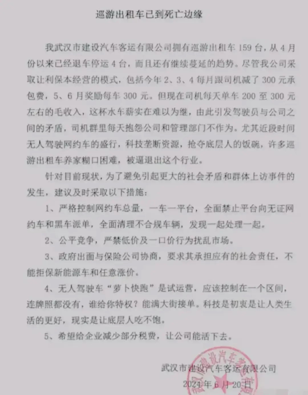甚至还有人翻出来就在上个月的月底,武汉的出租车公司还发过一封公开信抵制萝卜快跑。整的现在无人出租车和传统出租车就势不两立似的,直接就是一个你死我活。