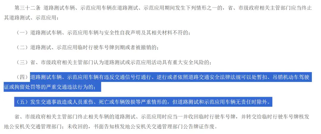 不过大佬们也提到了,在那个三部门连发的大规定里头有这么一条,写的是如果无人出租车发生了违反交规的行为,主管部门是可以吊销运营公司的测试牌照,也就是不让他们继续上路了。