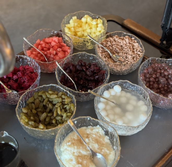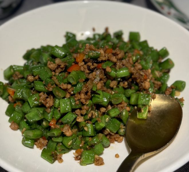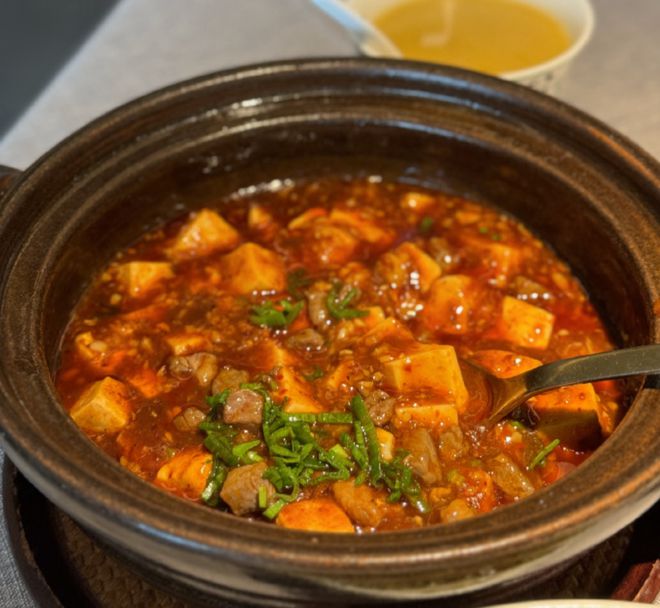 我们吃了四盘冷菜、和牛麻婆豆腐、酸萝卜老鸭猪肚汤、鱼香肉丝、榄菜肉沫四季豆、花椒猪舌尖、红糖冰粉。