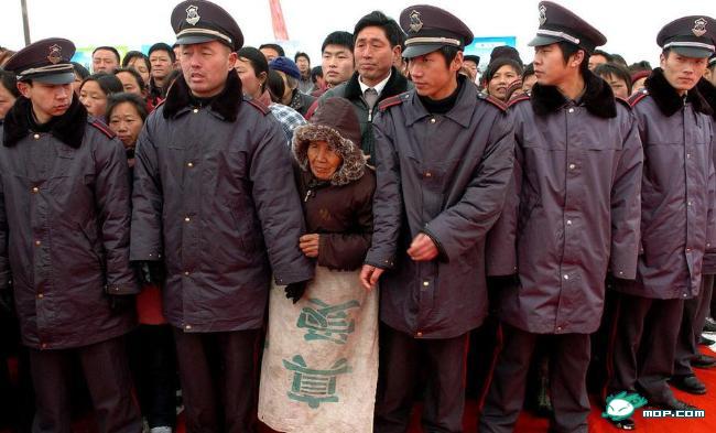 江苏省淮安市清河工业园区开工建设典礼现场,当地农妇在保安的阻挡下,观看在自己家土地上举行的开工仪式。