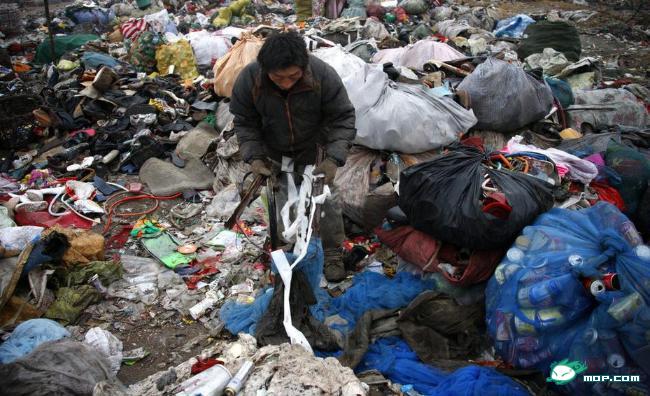 安徽淮北市郊区一露天垃圾填埋场,来自重庆开县的30多位农民在捡拾垃圾。
