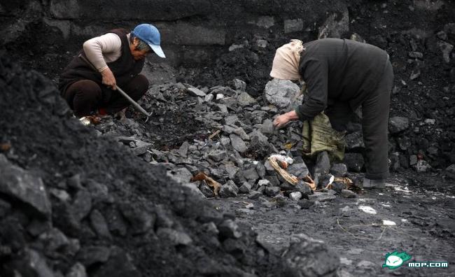 安徽淮北市,失地农民在一座煤矿的煤矸石堆里捡拾煤炭。