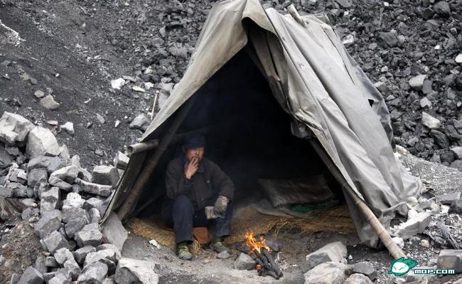 安徽淮北市,失地农民在一座煤矿的煤矸石堆里捡拾煤炭,一位农民工在窝棚里休息。