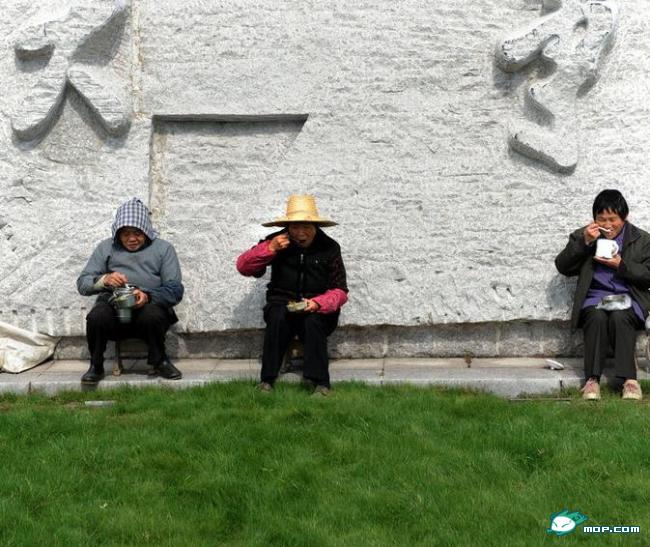 浙江嘉兴市区七一广场上,一群来自周边社区失去土地的、打零工大妈在“开天辟地大事变”碑刻下,享用自带的午餐。