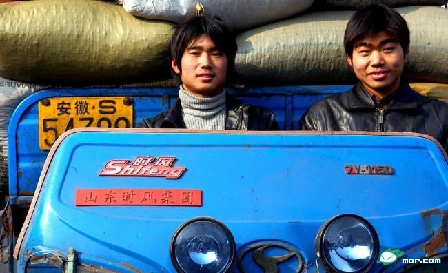 失地农民李雪峰【左】、李保同兄弟俩买了辆机动三轮跑运输 ,每天纯收入都能在百元以上。