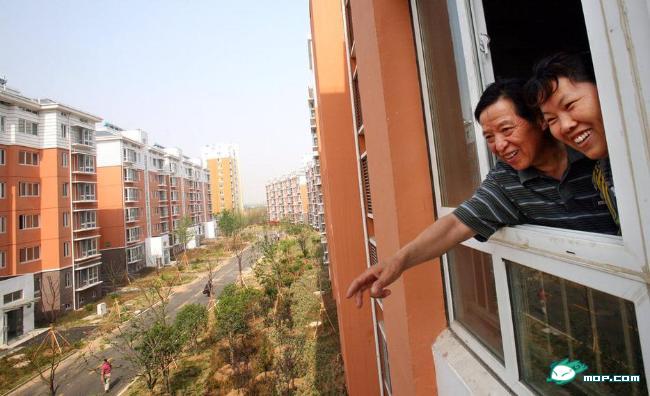 江苏省镇江新区“万顷良田改造工程”首批1027户失地回迁农民,李才桂、周国珍夫妇验房后在自家房内欣赏小区美景。