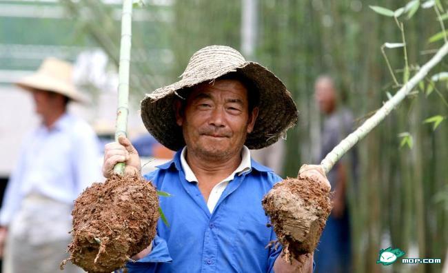 合肥,来自地方的失地农民从事城市绿化工作。 一位村民一手拿起一棵修剪好的竹子,送往绿化工地。