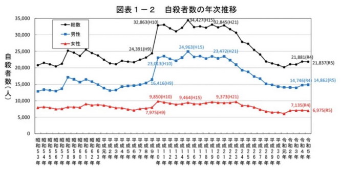 这两年,随着日本逐渐走出通缩,日本自杀率也开始下降。2023 年,日本自杀人数已经降到了 21000 人,相比起高峰时,已经减少了三分之一。