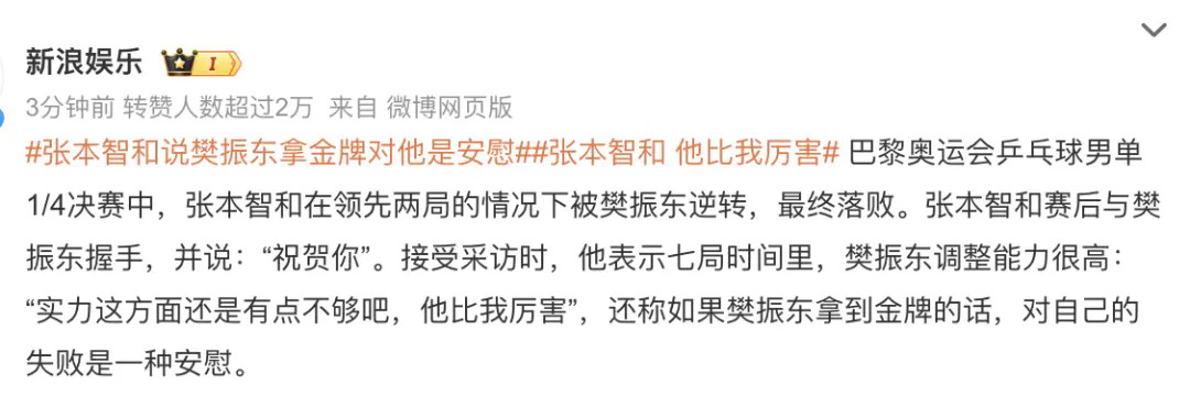 尽管这次四强和樊振东的拼死一战,张本智和遗憾落败于樊振东。