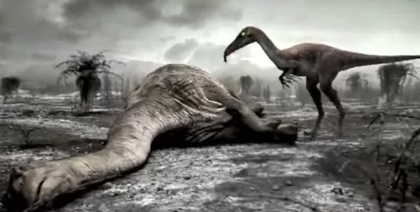 然而一切就这么结束了吗,并没有,这场燃烧了数月之久的大火最终熄灭了,假设你是一只劫后余生的恐龙,你也许为自己活着而感到庆幸,然而你不知道的是,真正恐怖的事情,才刚刚来临。你发现天空似乎被一片永不散开的乌云遮蔽了,陷入了永久的乌蒙蒙一片,看不到太阳,也看不到星星,气温骤降,甚至下起了你从没有看到过的雪,然而这雪花并不是白色的,而是黑色的,把大地染成了乌黑的一片,没有被烧死的幸存的植物,因得不到阳光和寒冷而枯萎死亡,那些劫后余生的食草恐龙也因得不到足够的食物而饿死,一开始你靠着吃那些死去的恐龙的尸体勉强的活着。