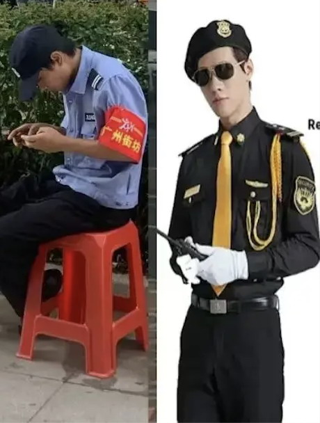 不同于那些商场和写字楼门口的形象保安,基本上都是清一色的黑西装加白衬衫的基础搭配。
