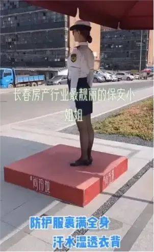 在形象保安届,有条硬性规定是不能站在遮蔽或封闭的保安亭内,这条规则并不会以天气变换而改变。