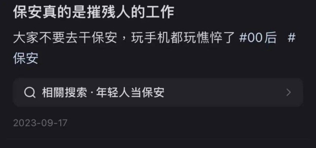 很长一段时间里,中文互联网语境下的保安是躺平的同义词。