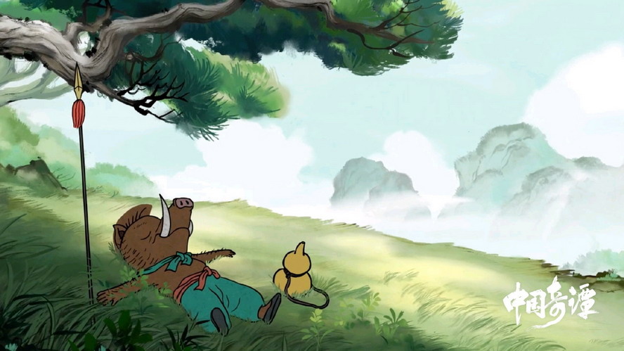 云彩快落地时,猪八戒看到,瞥见是个小妖怪,动起了刷功劳的念头,飞上去就是一耙。