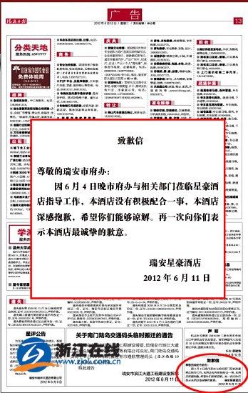 6月12日,浙江省瑞安市星豪酒店在《瑞安日报》上刊登了一则致歉信,内容如下:因6月4日晚市府办与相关部门莅临星豪酒店指导工作,本酒店没有积极配合一事,本酒店深感抱歉,希望你们能够谅解。再一次向你们表示本酒店最诚挚的歉意。