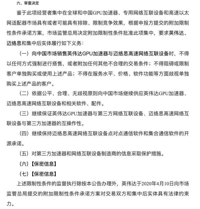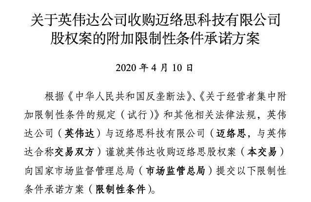 从 2019 年 4 月开始一直谈判到 2020 年 4 月 16 日,最后我国市场监管总局公布了一份?《 关于英伟达公司收购迈络思科技有限公司股权案的附加限制性条件承诺方案 》,也就是开头提到的 2020 年第 16 号公告。