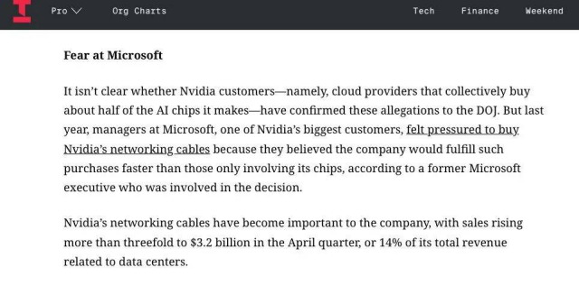 The Information 今年就有篇报道称,去年英伟达最大客户之一微软,就因为捆绑买网络电缆之类的基础设施闹的不愉快,但人家英伟达因为靠卖这玩意已经赚翻了。