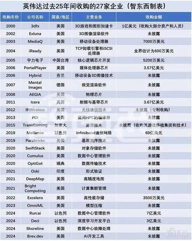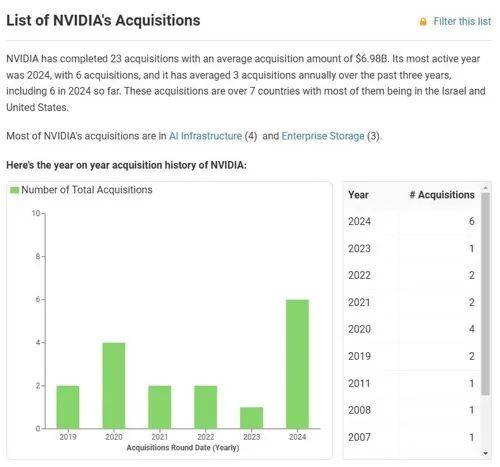 除了这些,也不知道是不是因为收购 InfiniBand 以后吃到了甜头,?自打 2019 年以来,英伟达的收购行为明显增多。