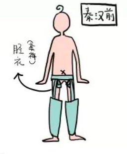 先秦时候,大家上身穿 “衣”,下身穿 “裳”。如果你胆敢捞起别人的裳,会看到 “胫衣”,字面意思就是小腿穿的衣服。这个东西是裤子的雏形,没有裤裆,没有裤腰,就是两只分开的裤管,覆盖小腿附近,上端用带子把它固定在腰上,主要起个保暖作用,跟护膝有点像。