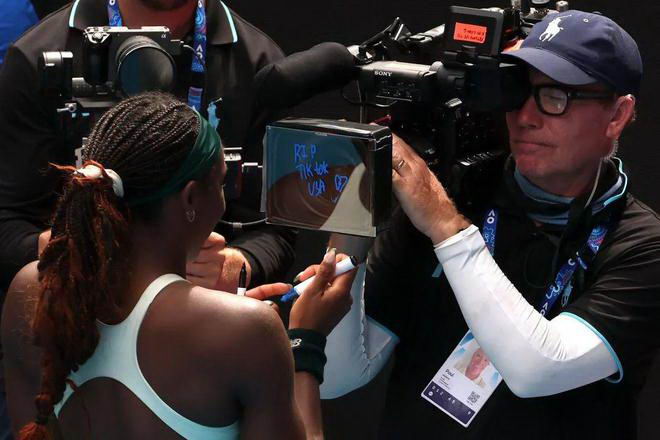 ▲当地时间.1.月.19.日,澳大利亚墨尔本,高芙晋级澳网女单.8.强后在镜头前写下.“RIP.TikTok.USA”。图./.视觉中国