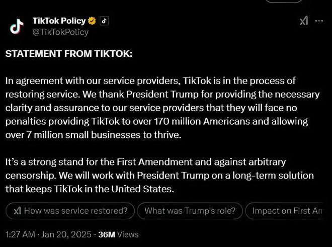 ▲美东时间.19.日下午,TikTok.官方发布声明:正在恢复对美国用户服务。图./.网络