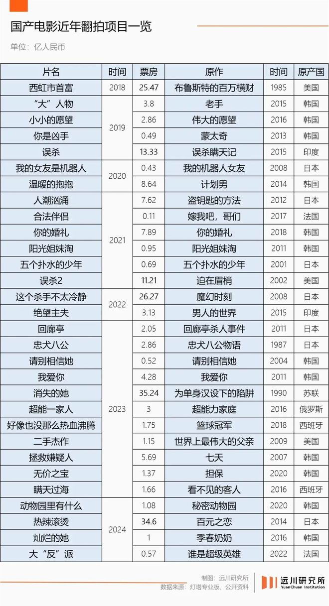 如今的电影市场,翻拍片比横店的抗日神剧还密集:日本的《百元之恋》变成了《热辣滚烫》,韩国《老手》变成《大人物》,日本《盗钥匙的方法》被包装成《人潮汹涌》,意大利《完美陌生人》则变成了《来电狂响》,西班牙《黑暗面》和《看不见的客人》化身《门锁》和《瞒天过海》……