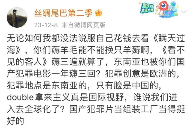如同《芭比》在欧美性别文化中成为一种尺度,中国电影也流行.“把陈思诚作为方法”——?它在投资上是正向的,在审美上是反向的,即一部国产片.“含陈量”.越高,就越能吃到下沉红利。