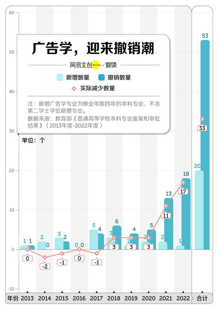 但近几年,越来越多高校开始撤销广告学。教育部数据显示,2013 年到 2022 年,共有 53 所高校撤销了广告学专业,其中不乏中山大学、山东大学、安徽大学等 985、211 名校。