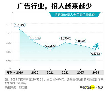毕业生们也感到了广告行业传来的寒气,职友集数据显示,近年来广告行业招聘职位数持续下滑,2024 年广告行业招聘职位数相比上一年降低 18%。