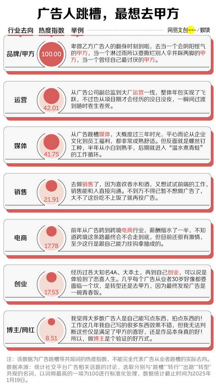 我们统计并分析了社交平台上广告行业工作相关跳槽去向的讨论,发现对于不少广告人来说,跳槽的终极目标是进入甲方公司。