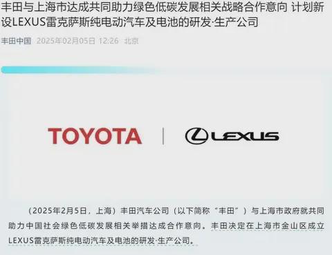 2025 年 2 月 5 日,丰田官方宣布,旗下豪华品牌雷克萨斯将在上海独资建厂。