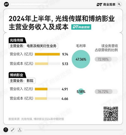 影院本应是博纳影业的护城河,但当线下观影受到冲击,重资产反而成了包袱,2024 年上半年,博纳影业的影院收入同比减少 16.41%,毛利率只有 5.18%。