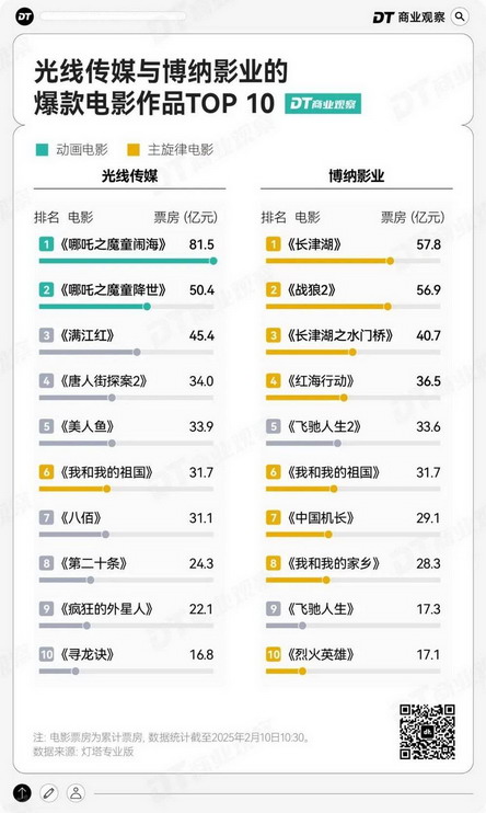 在光线传媒票房 TOP10 的电影中,有两部动画电影《哪吒之魔童闹海》《哪吒之魔童降世》,一部主旋律电影《我和我的祖国》,此外,战争、悬疑、喜剧、现实等题材,光线传媒也都有所涉猎。