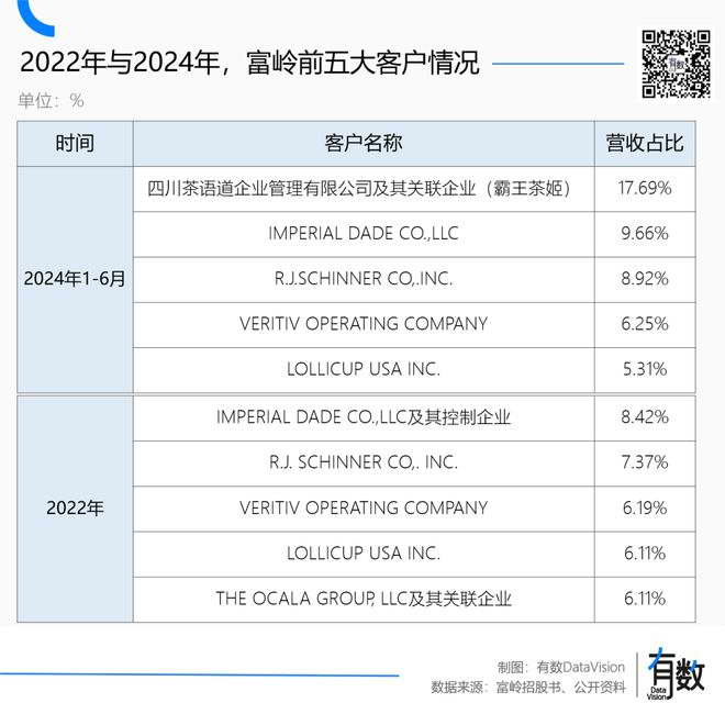 2022 年,霸王茶姬甚至不是富岭的前五大客户,但到了 2024 年上半年,霸王茶姬为后者贡献了 17.69% 的营收。