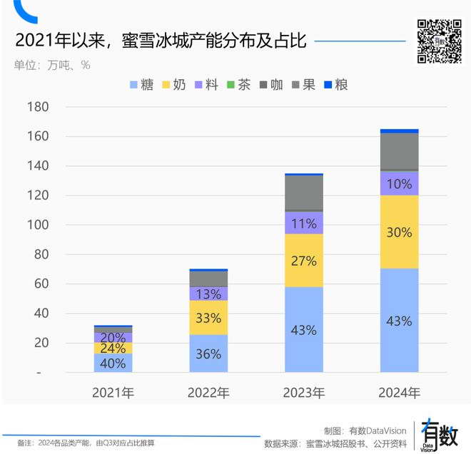 2021 年蜜雪冰城门店破万时,年内新增产能就超过 17 万吨。目前,蜜雪冰城五大生产基地的年产能总和约 165 万吨。