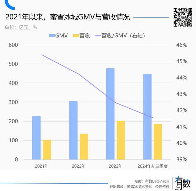 过去三年,蜜雪冰城营收占门店 GMV 的比值由 45.4% 降至 41.6%。也就是说,加盟商从蜜雪冰城进货的价格实际上在变便宜。按照日均营收 4000 元的数据测算, 加盟门店每年能多赚 5.6 万。