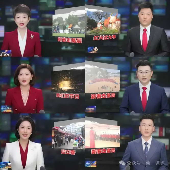 很多时候,我国新闻的播音主持努力要做的,就是成为冰冷的 AI。他们长期接受的训练是 “去人格化”:同样的服饰、同样的发型、同样无表情的面容,连浓眉都得画得一模一样。