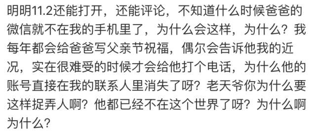她不明白,为什么 11 月初还能打开聊天页面,也能评论朋友圈,怎么 2 个月后父亲账号就从手机里消失了?