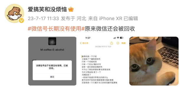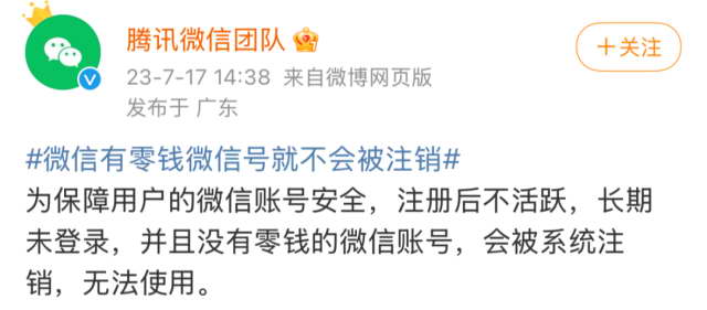 2023 年 7 月,有条话题冲上了微博热搜:微信号长期没有使用会被回收。因为一个博主发现自己的树洞微信太久没登被回收了。